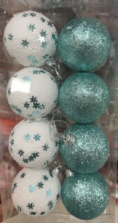 KARÁCSONYFA GÖMB DÍSZ MŰA. 6CM FEHÉR ÉS TÜRKIZ 8DB