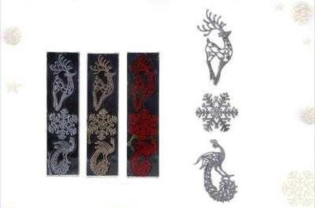 KARÁCSONYI DÍSZ DOBOZOS MEDÁLKÉSZLET "HÓPEHELY, SZARVAS ÉS PÁVA" 5DB
