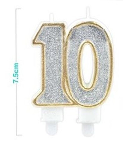 SZÁMGYERTYA "10" 7,5CM ARANY SZÉLŰ EZÜSTPOROS