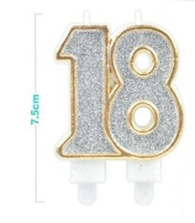 SZÁMGYERTYA "18" 7,5CM ARANY SZÉLŰ EZÜSTPOROS