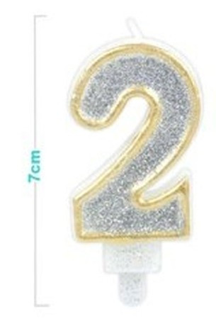 SZÁMGYERTYA "2" 7CM ARANY SZÉLŰ EZÜSTPOROS
