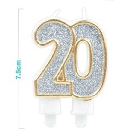 SZÁMGYERTYA "20" 7,5CM ARANY SZÉLŰ EZÜSTPOROS