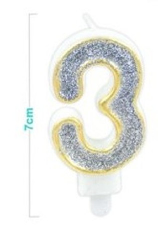 SZÁMGYERTYA "3" 7CM ARANY SZÉLŰ EZÜSTPOROS