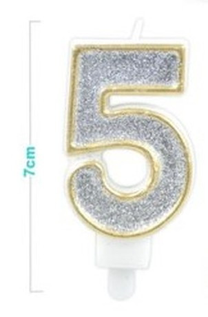 SZÁMGYERTYA "5" 7CM ARANY SZÉLŰ EZÜSTPOROS
