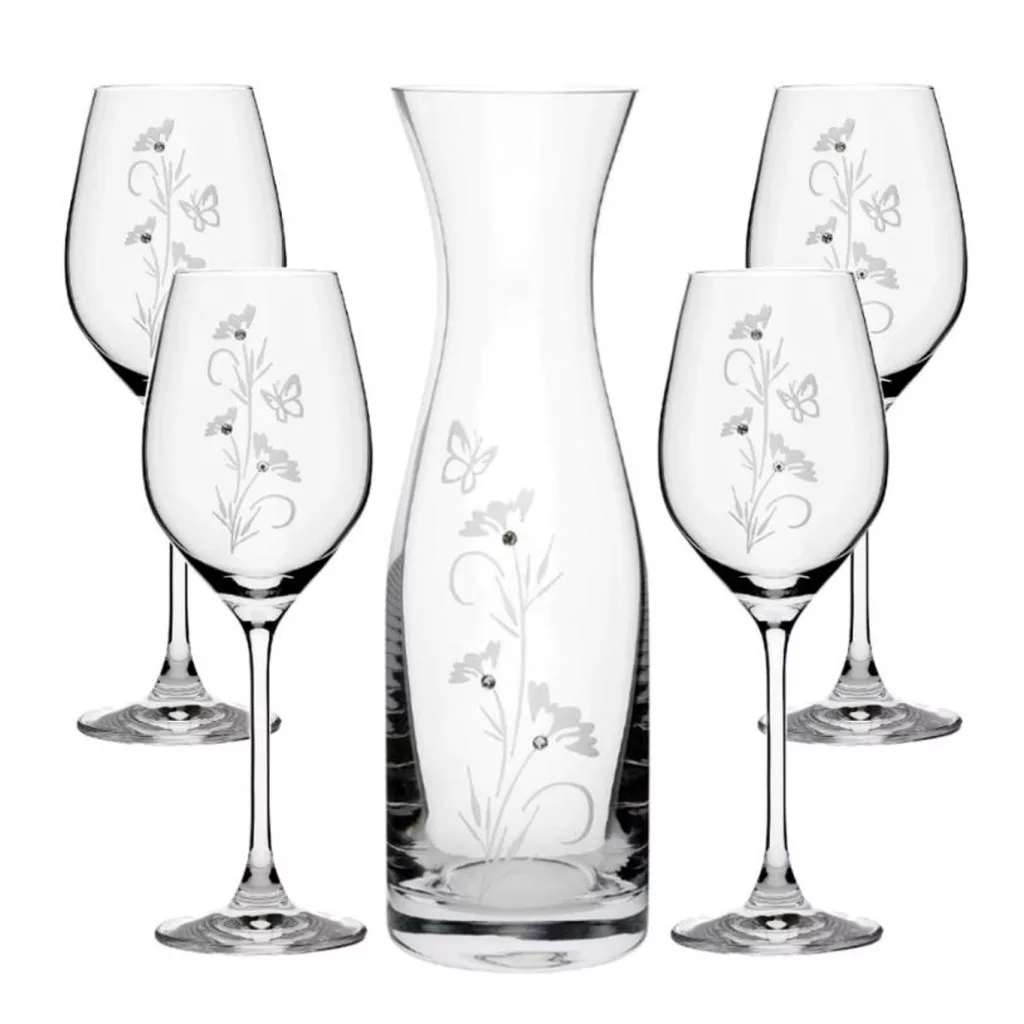 BOROSPOHÁR + KANCSÓ SZETT 5DB-OS, KRISTÁLYBERAKÁSSAL DÍSZÍTETT, VIRÁG MINTÁS 100