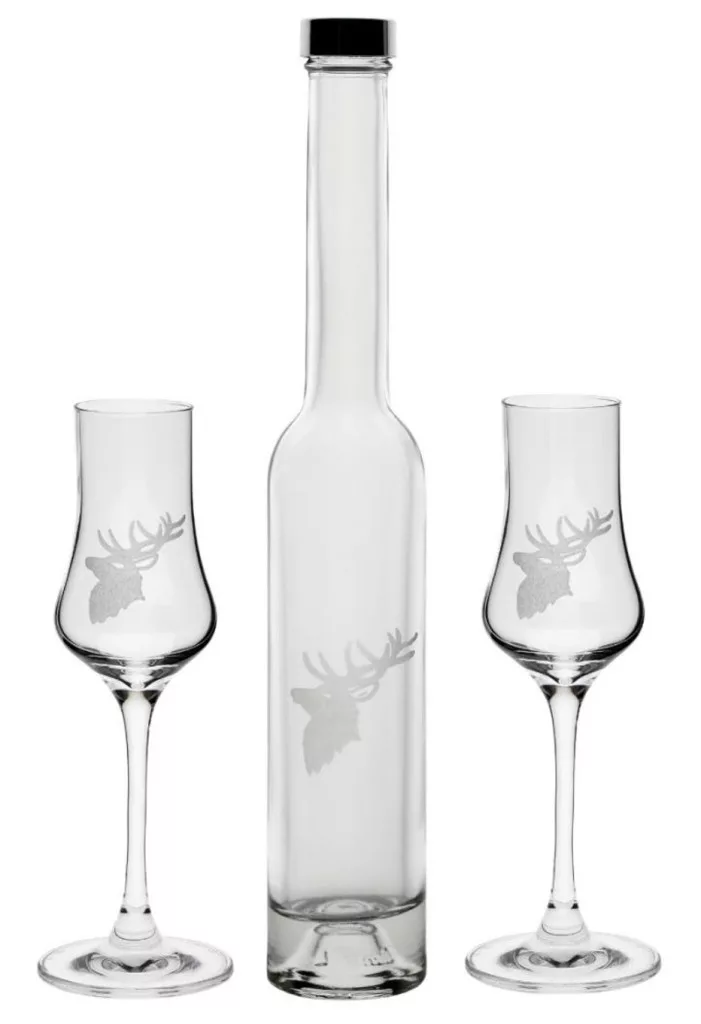 RÖVIDITALOS SZETT 3DB-OS (2DB GRAPPÁSPOHÁR + 1 DB PÁLINKÁS ÜVEG), SZARVAS MINTÁS