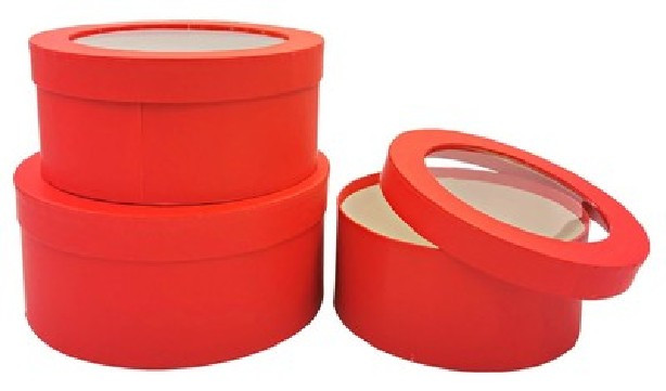 DÍSZDOBOZ SZETT 3R. KEREK, ÁTTTETSZŐ FEDÉL , 22X10CM, 20X9CM,18X8CM PAPÍR, PIROS