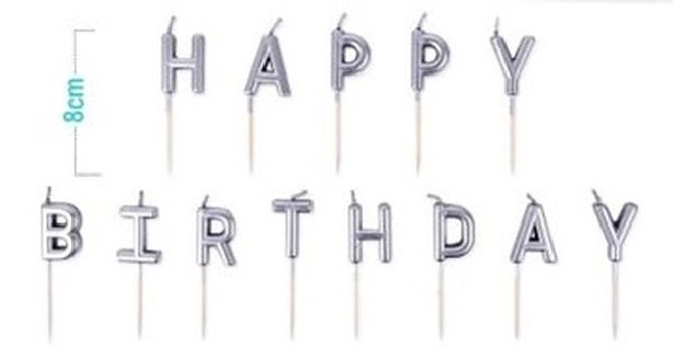 SZÜLINAPI GYERTYA 13DB "H A P P Y B I R T H D A Y" 8CM EZÜST